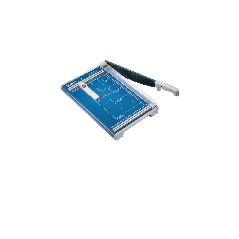 Corte mediante palanca con sistema de fricción. Tope angular para perfecto alineado de papel. Capacidad de corte 1.5mm 15 hojas. Longitud de corte: 340mm – A4. Dimensiones: 443x285x100mm. Peso: 3,9kg.